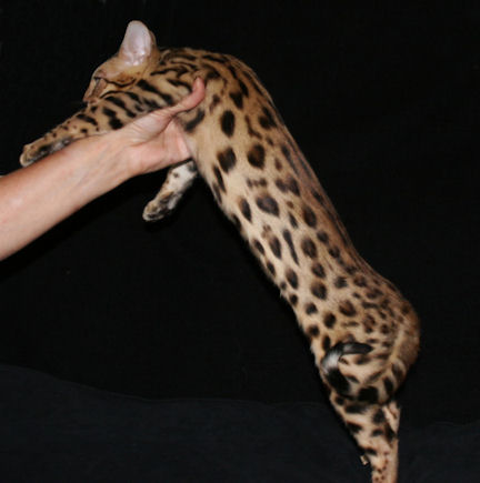 We are proud to co-own this fabulous boy with our great friends, Walt and Gail at Absolutely Bengals. ‘Cat” has a long muscular body with a fabulous head and perfect pattern with big try colored rosetting and a personality to die for.